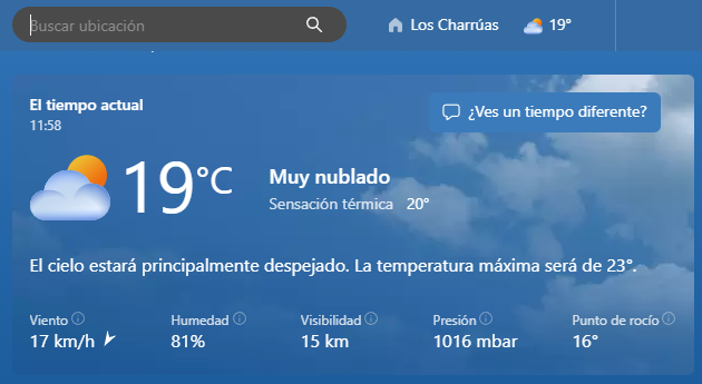 Pronóstico del tiempo en Los Charrúas para la tarde y la noche Para después del mediodía, se prevé que el cielo estará parcialmente nublado, y los vientos del sector noroeste tendrán velocidades estimadas entre 7 y 12 kilómetros por hora. La temperatura máxima pronosticada es de 22 grados.