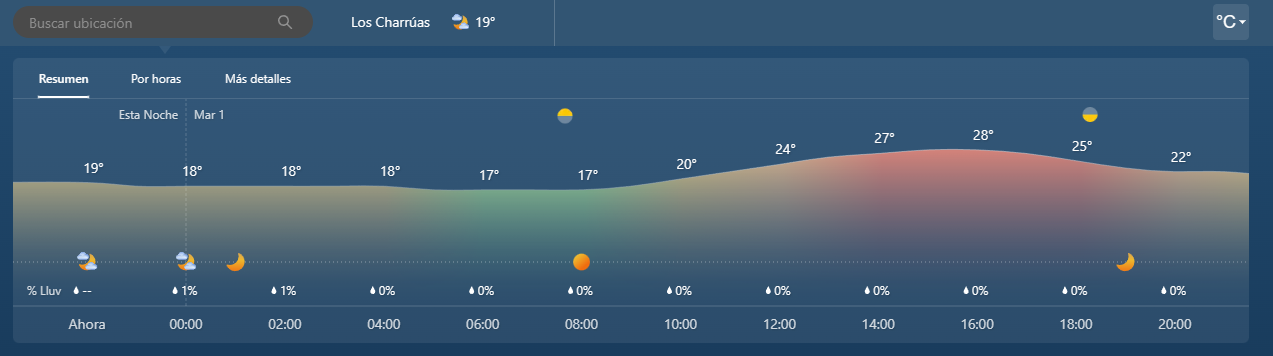 Mañana por la noche, en nuestra localidad, se espera una temperatura de 20°C y un viento que sople con una velocidad de 12 Km/h.