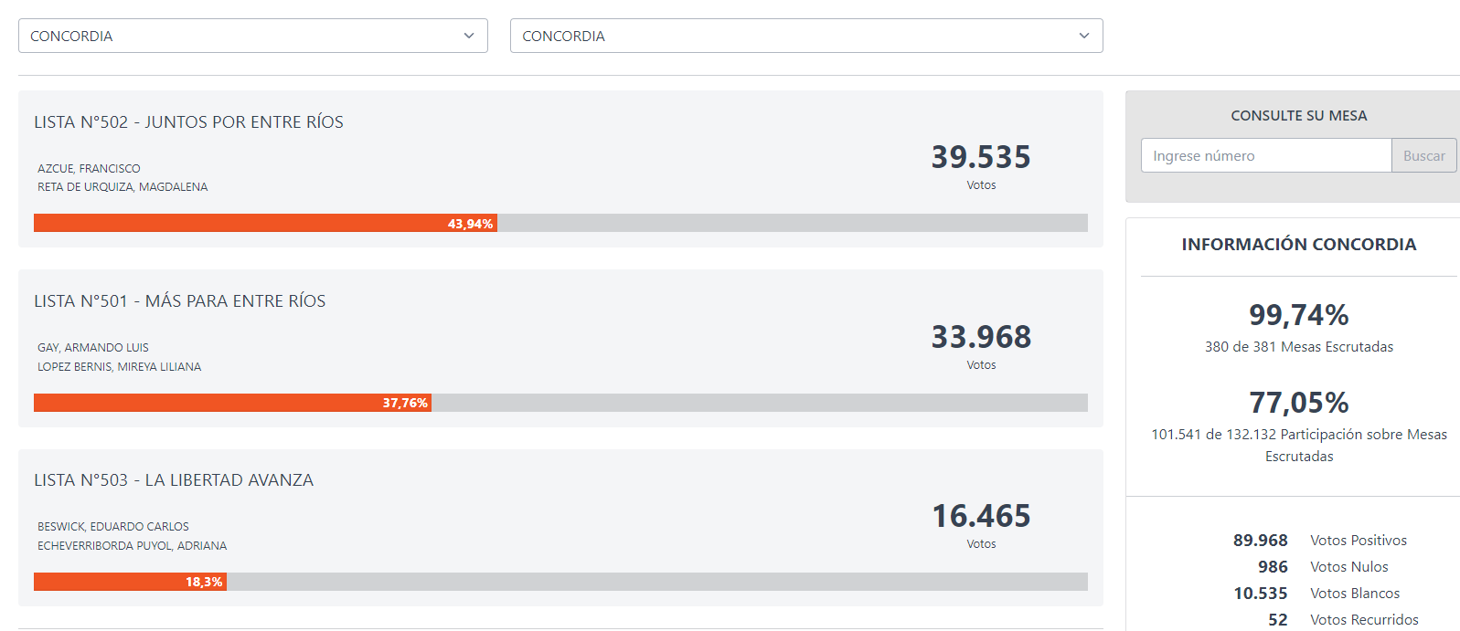 Con el 99% de las mesas escrutadas al cierre de esta edición, Azcué se impuso sobre Armando Gay, de “Más por Entre Ríos“, quien obtuvo el 37,7% de los sufragios. Eduardo Beswick quedó en tercer lugar con el 18,2% de los votos. Este triunfo marca un hito, ya que Azcué será el primer intendente en más de cuatro décadas con un signo político distinto al peronismo, que había gobernado la ciudad desde 1983.