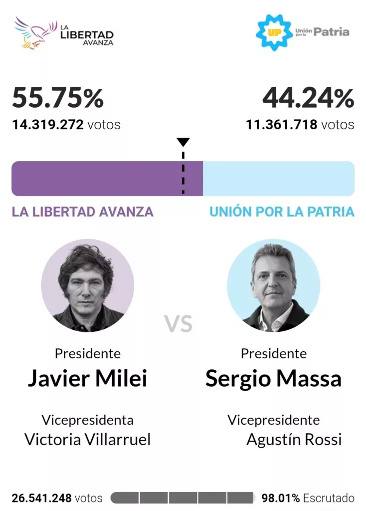 Con el 95,31% de las mesas escrutadas, el binomio conformado por Javier Milei y Victoria Villarrel se consagra como el ganador en la segunda vuelta electoral, alcanzando el 55,78% de los votos (13.948.016). En una competencia reñida, superaron a Sergio Massa y Agustín Rossi, quienes lograron el 44,21% (11.053.308). Pocos minutos después de las 21, la Cámara Nacional Electoral confirmó los resultados que indicaban el triunfo de Javier Milei en la elección presidencial.