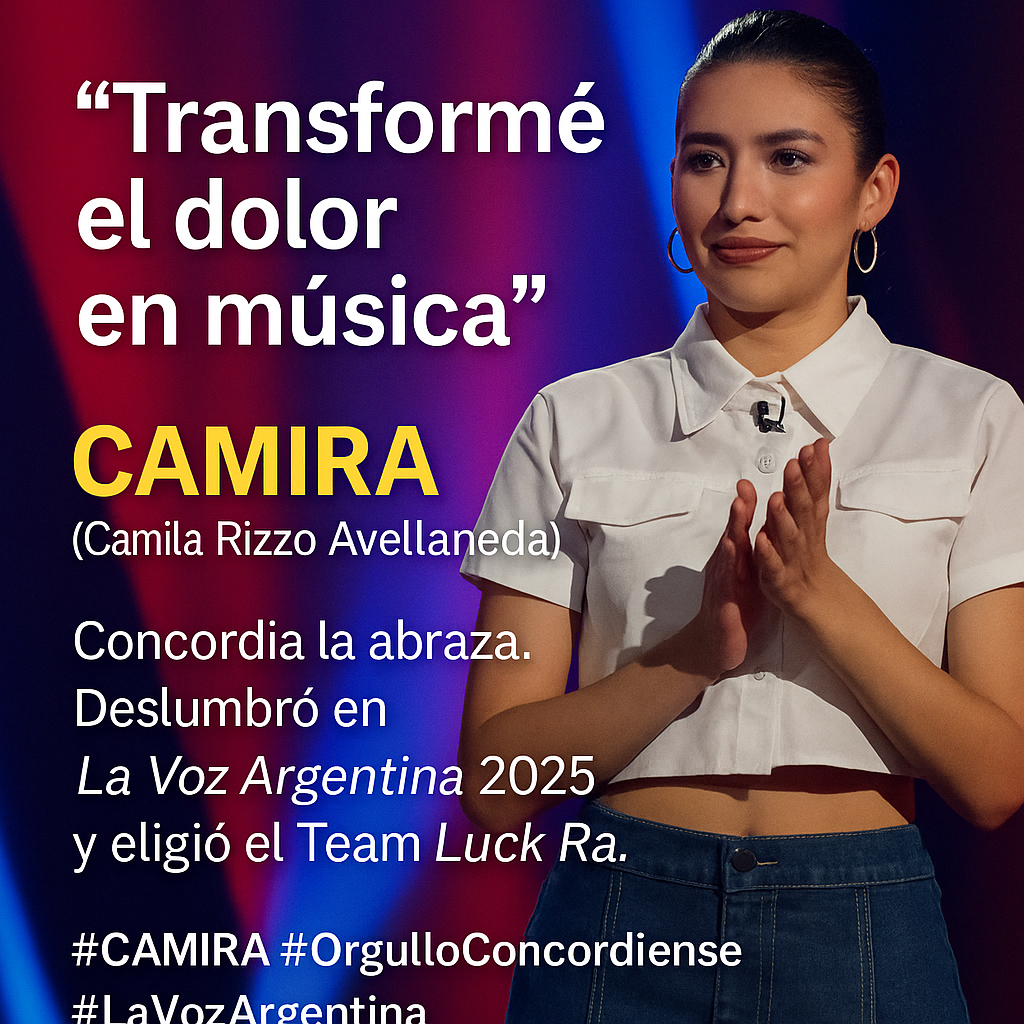La joven cantante Camila Rizzo Avellaneda, oriunda de Concordia, debutó este martes en la edición 2025 de La Voz Argentina y conmovió a todos con su historia y su talento. Su interpretación de “Amor de Tres” —popularizada por Ángela Leiva— deslumbró al jurado del reality de Telefe, que giró en pleno para sumarla a sus equipos. Finalmente, Camila eligió integrar el Team de Luck Ra, el cuartetero cordobés.