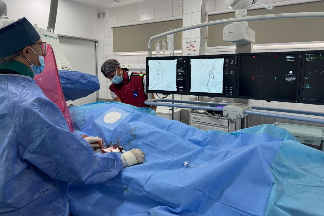 Posteriormente, en el Servicio de Hemodinamia del hospital se llevó a cabo un cateterismo selectivo de la arteria carótida. Este procedimiento fue clave para caracterizar en detalle la lesión y establecer un diagnóstico certero.