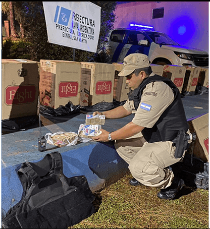 Efectivos de la Prefectura Naval Argentina decomisaron un cargamento de mercadería y droga, valuados en cerca de 9.000.000 de pesos, que pretendían ser ingresados al país por la costa de la ciudad misionera de Puerto Rico El procedimiento se inició cuando el personal de la Fuerza, que se encontraba realizando un patrullaje de vigilancia a la altura de kilómetro 1.738 del río Paraná, observó a una embarcación que estaba efectuando un cruce transversal desde la costa paraguaya a la argentina, con dos tripulantes y varios bultos a bordo.