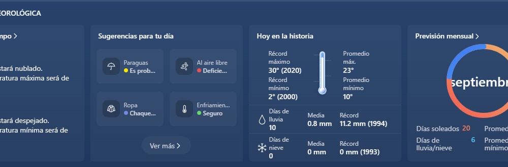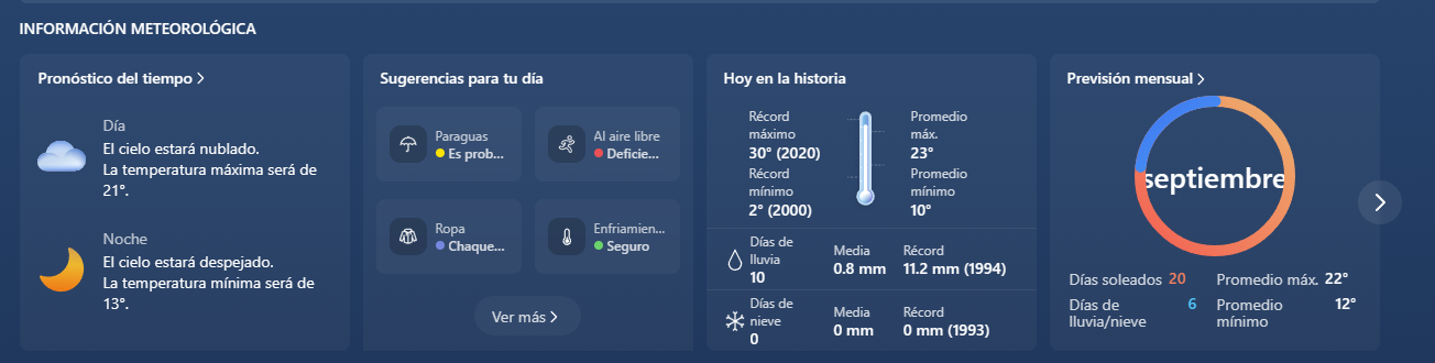 Tarde y Noche : Por la tarde, se esperan chaparrones con vientos del este a velocidades de 13 a 22 kilómetros por hora y una temperatura pronosticada de 19 grados. Durante la noche, la temperatura descenderá a alrededor de 15 grados, con vientos del este a la misma velocidad que en la tarde y una probabilidad de lluvia que varía entre el 10 y el 40 por ciento.