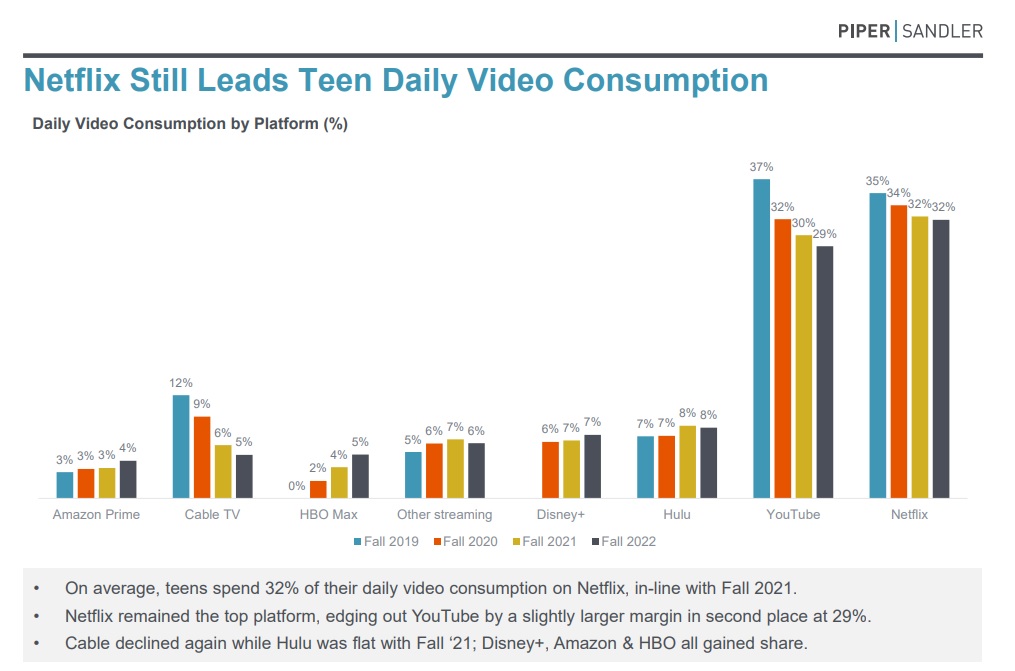 Los datos revelan que los adolescentes encuestados pasan el 29,1% de su tiempo diario de consumo de video en Youtube (YT), propiedad de Google, superando a Netflix por primera vez en la historia, con un 28,7%. Esta noticia marca un hito en la industria del entretenimiento, ya que la empresa de google es una plataforma de acceso gratuito, atrajo a una audiencia más joven en comparación con Netflix, que requiere pagar por una suscripción